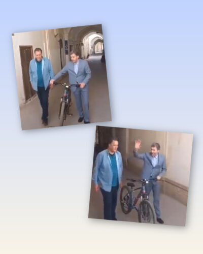 در این حین مهدی جمالی نژاد ، دوچرخه به دست در کنار یکی از مستندسازان صدا و سیما در حرکت هستند .
